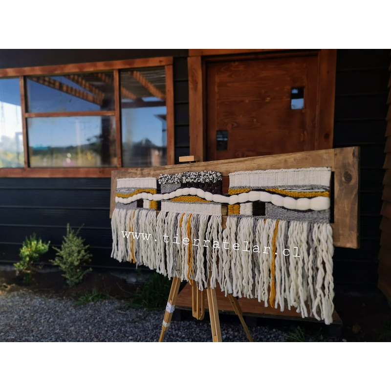 Telar decorativo triple, tejido con lana 100% de oveja en marco de madera reciclada
